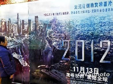 2009年11月12日晚,在湖北宜昌市解放电影院,市民在观看《2012》电影海报。由《后天》导演罗兰·艾默里奇执导的灾难大片《2012》将于11月13日零点在全球同步上映。 中新社发 刘君凤 摄文章摘录如下: