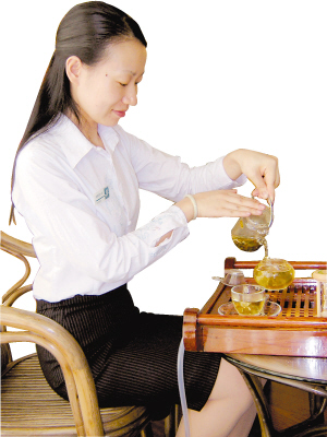 泡花果茶吧的另一乐趣就是可以学到许多专业的茶知识,把精神转移不失为一个减压的好方法。一般来说,每道花果茶都可以泡三次,每次冲泡时间要递增,第一泡是2分钟,第二泡3分钟,第三泡就需4分钟,其中第二泡是每道花果茶的精华所在。品茶方法是先闻后品,每次品花果茶最好是分三口。
