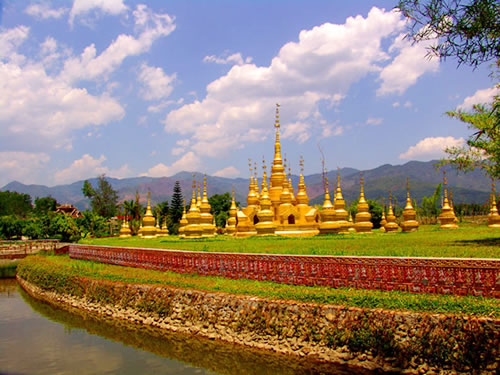 西双版纳佛寺、佛塔很多,其中最著名的是大勐龙佛塔和景真八角亭。大勐龙佛塔是一组群塔,位于景洪县大勐龙的曼飞龙寨后山上,也称曼飞龙塔,由九座白塔组成,主塔高16.29米,四周八个小塔都高9.1米。塔群造型优美,风格别致。坐落在景洪澜沧江对岸的曼阁佛寺,是一座建筑风格特殊、造型轮廓风姿迷人的佛寺。景真八角亭也称勐真佛塔,位于勐海县城西14公里的景真山,高15.42米,宽8.2米,呈八角形。它的八个边每边都有10个人字形屋脊,一层套一层,一直到塔顶。塔顶有一个伞状顶帽,上面的金属薄片上刻有网状哨眼,风一吹动,便发出哨声。据傣族佛经记载,这个佛塔是古代傣族佛教徒,仿照佛祖释迦牟尼的帽子式样修造的,是傣族佛教建筑艺术中的珍品。