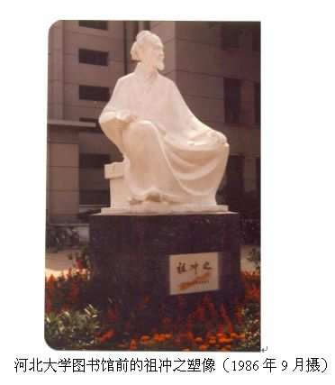 为纪念祖冲之这位祖藉河北保定的科学家,在他的故乡河北保定市,河北大学1986年9月9日在图书馆的大门前,建立了祖冲之塑像(河北日报1986年9月10日头版有专门的报导)。因祖冲之的事迹早己进入了小学教材之中,塑像建成不久,就常有老师带着小学生排队前来瞻仰。